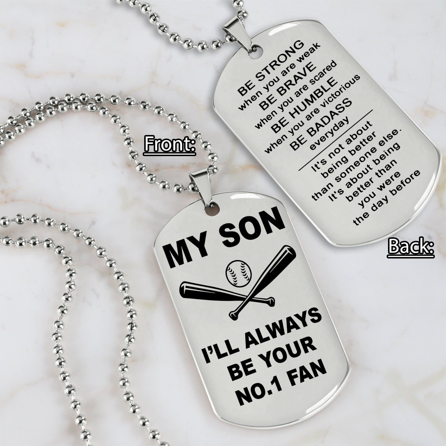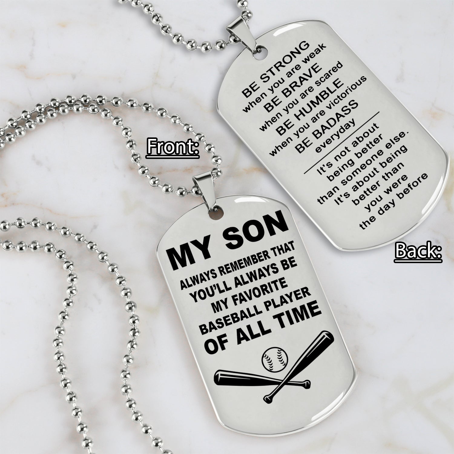 Baseball customizable engraved double sided dog tag gifts from dad mom to son, Be strong be brave be humble, It is not about better than someone else, It is about being better than you were the day before