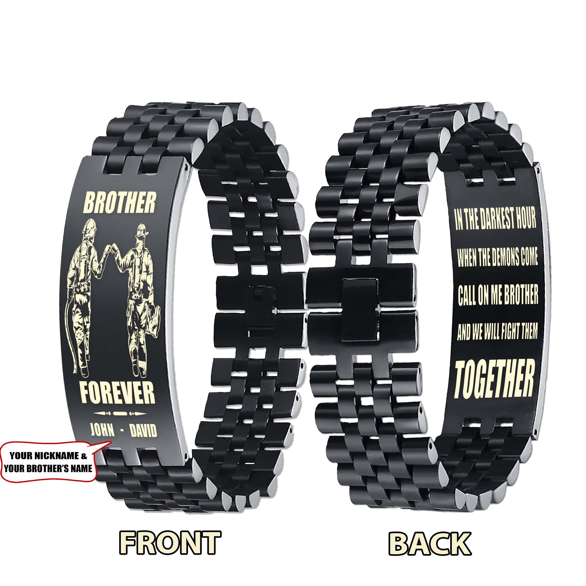 Biker customizable engraved brother bracelet double sided gift from brother, brother forever, in the darkest hour, When the demons come call on me brother and we will fight them together